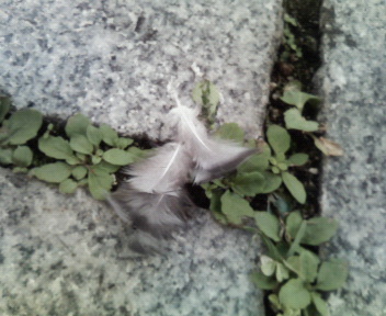 なのですが、鳩の数は日々まちまち その日は30~40羽の鳩がいて、私の少ない昼ご飯を奪っていたんです かなり慣れているので、足下近くにも寄ってきます すると、いきなり私の足が後から押されました。 ベンチの下です 何? と思って目線を下げたら… 鳩を猫が一撃で倒しているところ… 鳩は暴れる暇もなく動かなくなり… そこまで見たところで、他の鳩たちが一旦ちょっと離れて… 猫は何事もなく、優雅に鳩を加えて歩き去っていきました とも考えましたが、「猫のランチを邪魔する権利は私にはないな」と 只、見送り… また戻ってきた鳩たちに残ったパンを全て与え、仕事に行きました 写真は猫がいなくなった後に残った羽根 これだけがわずかな証拠 |
